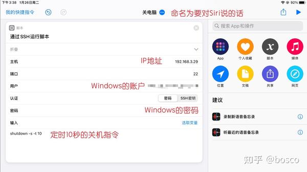 首先肯定是新建一个快捷指令,搜索SSH,分别填入Windows的IP地址、用户名以及密码